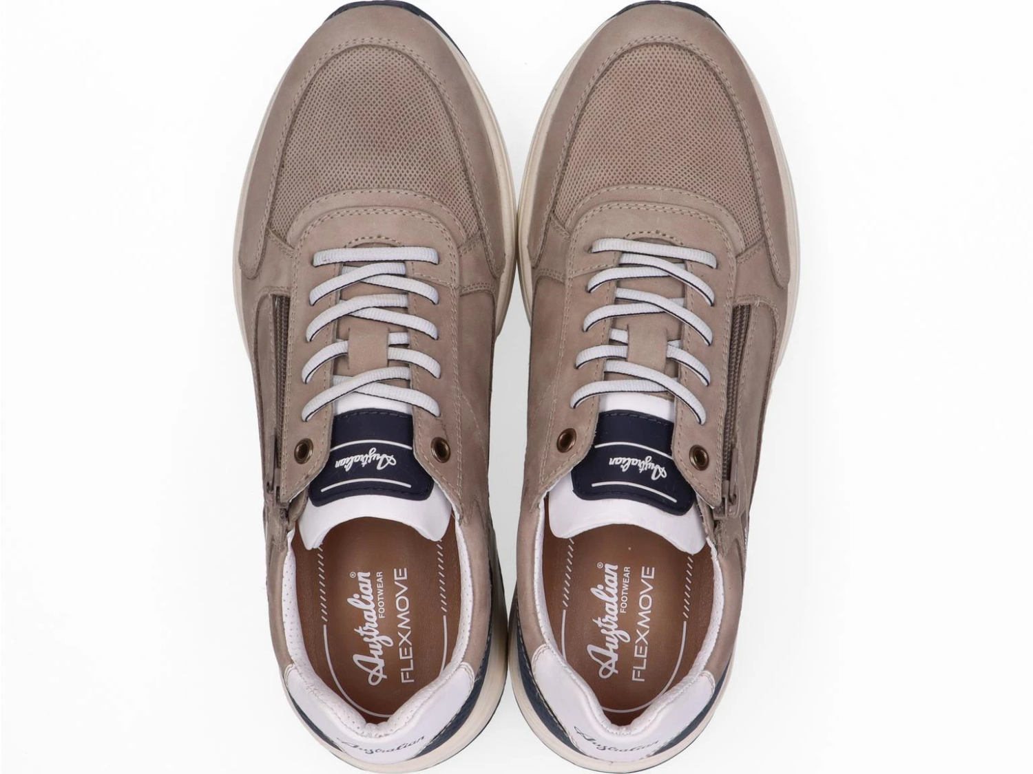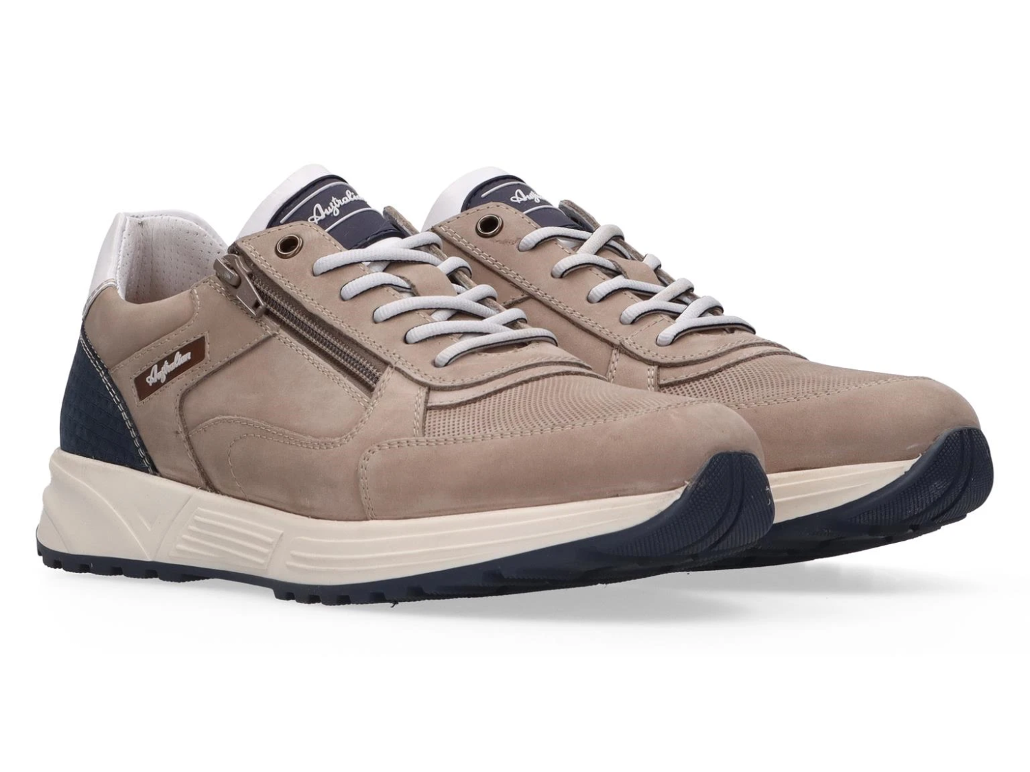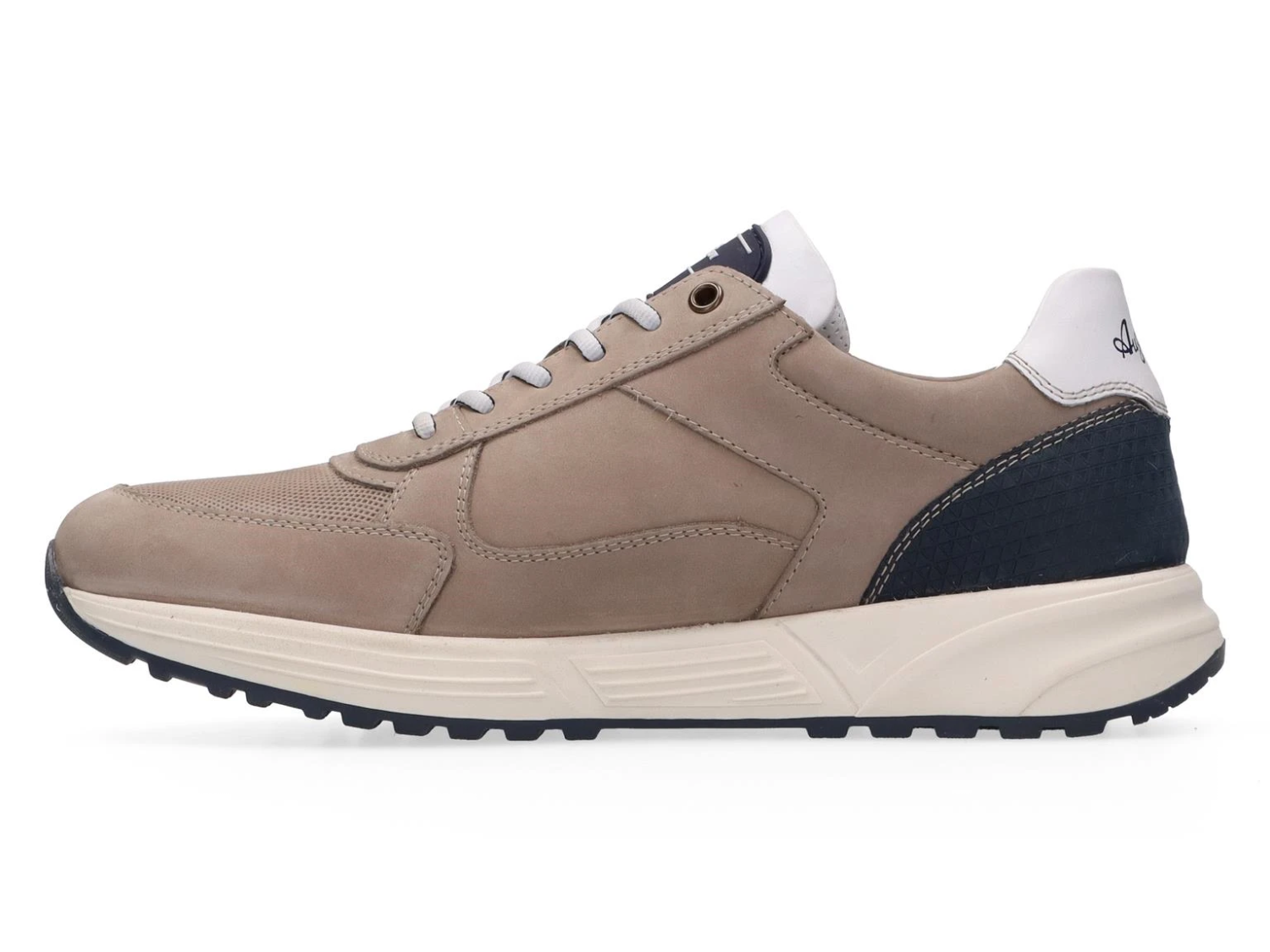 Taupe sneaker met blauwe accenten