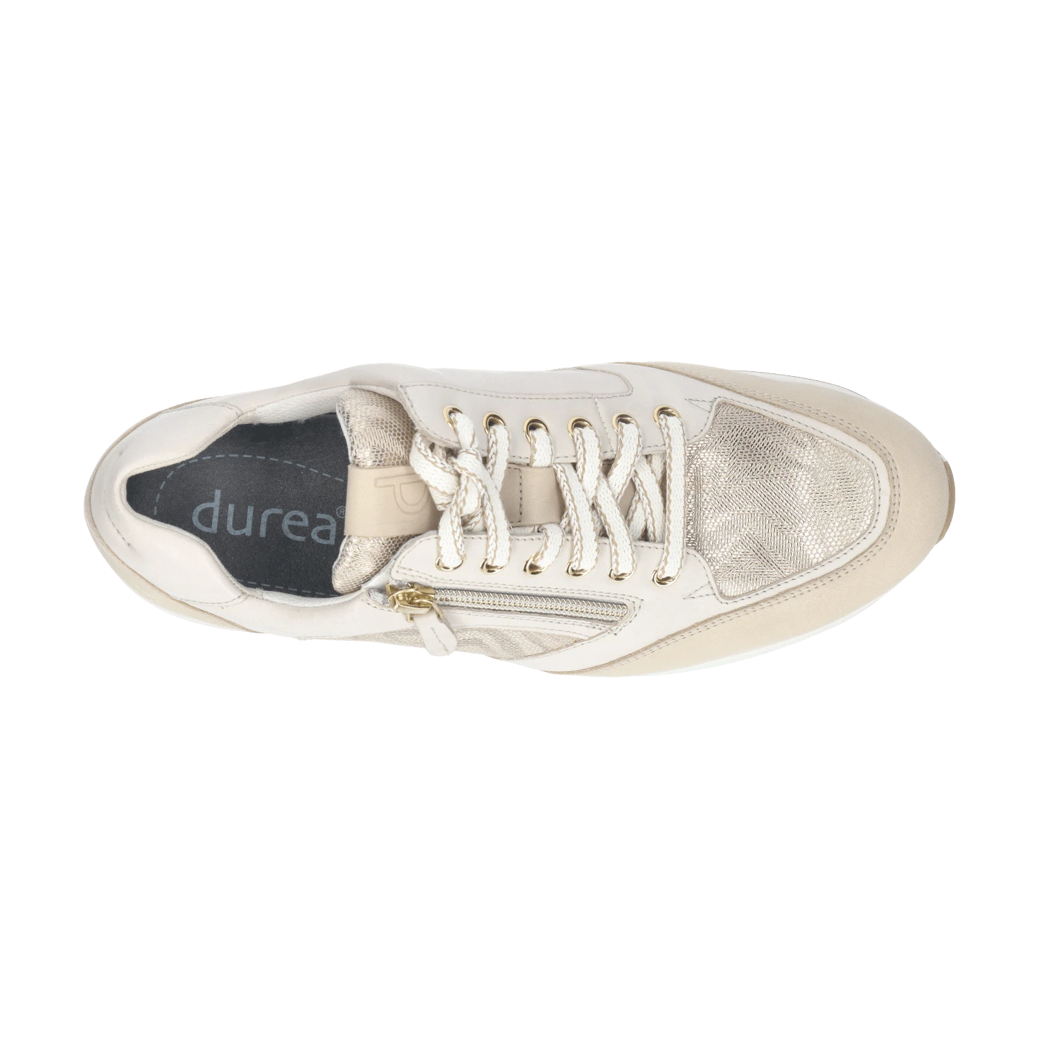 Het bovenwerk valt op door een dynamisch lijnenspel en een luxe mix van materialen. Op de tong prijkt ons Durea logo: een stempel van kwaliteit. Wat je niet meteen ziet, maar wel voelt, is de zachte polstering aan de binnenzijde van de hiel, die voorkomt dat de hielversteviging tegen je voet drukt. De klassieke derby-stijl vetersluiting in combinatie met de rits zorgt voor een gemakkelijke instap.