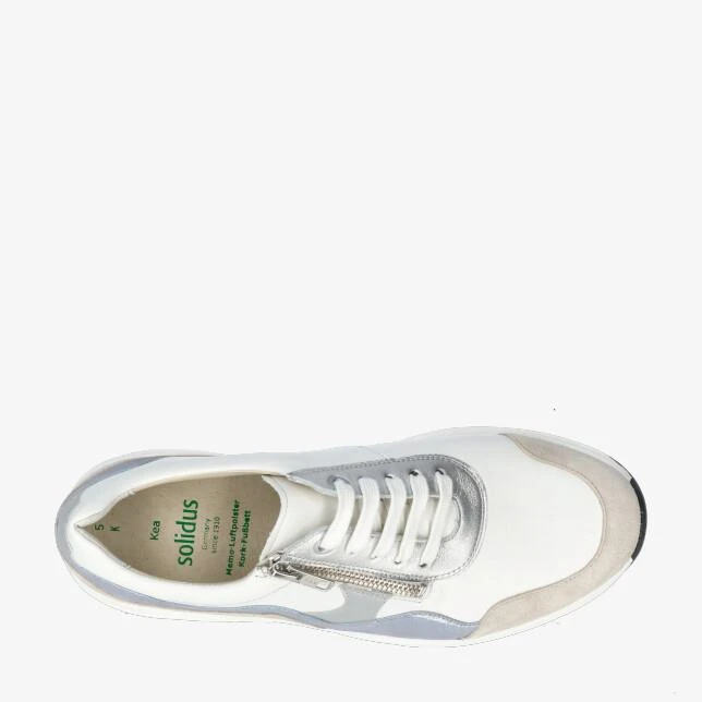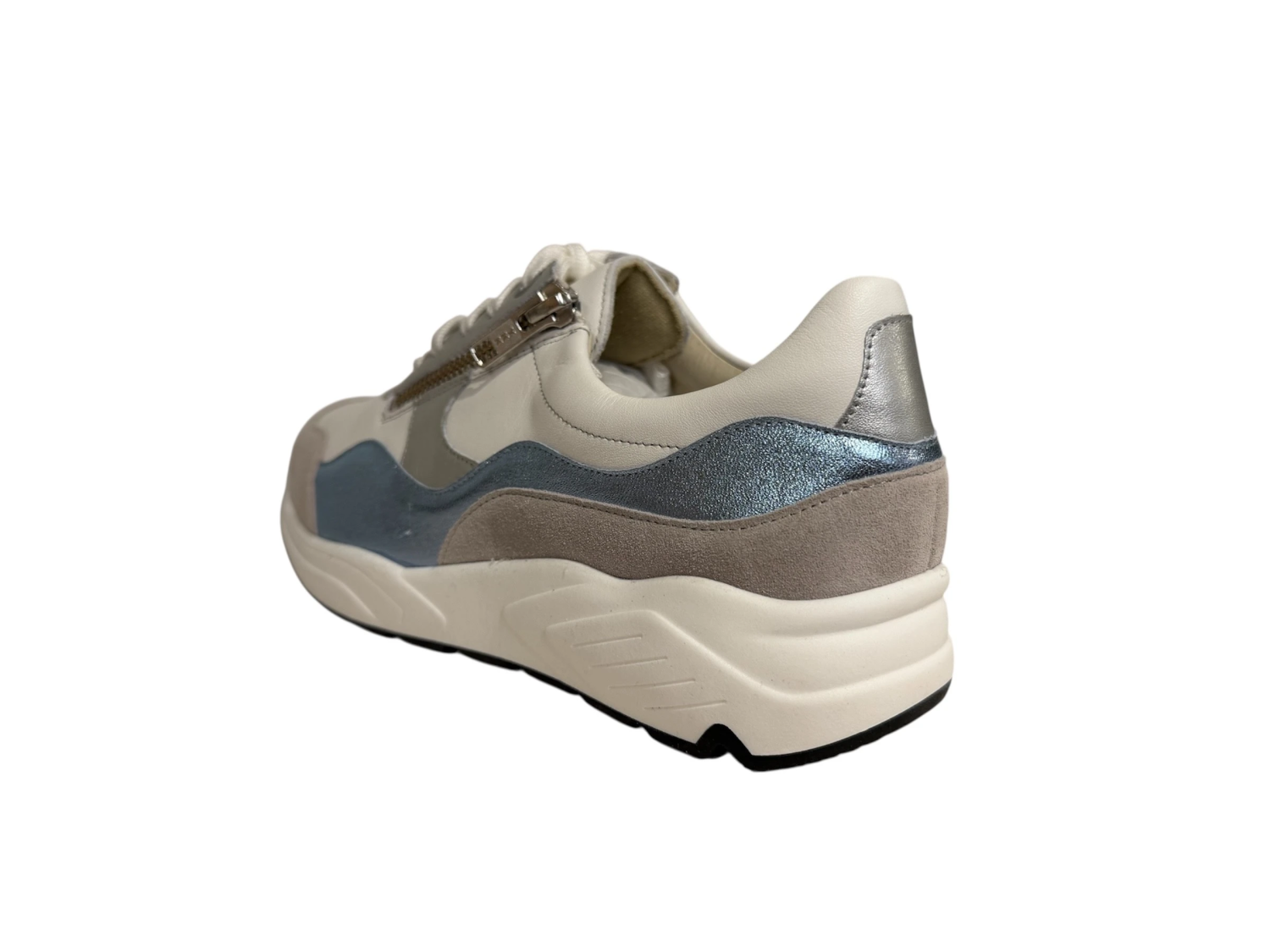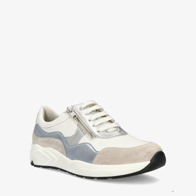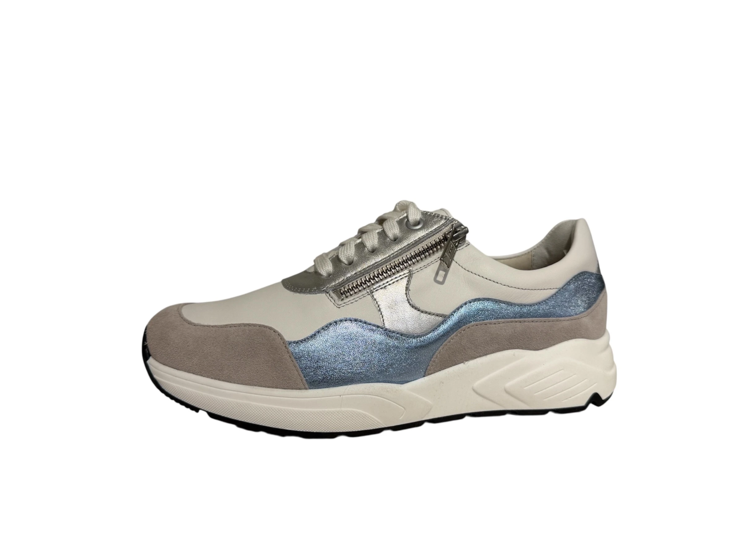 Witte damessneaker met metallic blauw, zilver en taupe accenten.